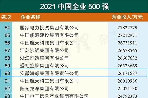 2021年9月24日—25日,2021中國企業(yè)500強(qiáng)高峰論壇在吉林長春舉行,向社會發(fā)布了“中國企業(yè)500強(qiáng)”榜單。海螺集團(tuán)連續(xù)17年入圍中國企業(yè)500強(qiáng),榮列2021中國企業(yè)500強(qiáng)第90位,較2020年上升了2位;同時,榮列2021中國制造業(yè)企業(yè)500強(qiáng)第32位;榮列2021中國跨國公司100大第89位,比2020年上升7位;首次登上中國2021大企業(yè)創(chuàng)新100強(qiáng)榜單,名列第89位。