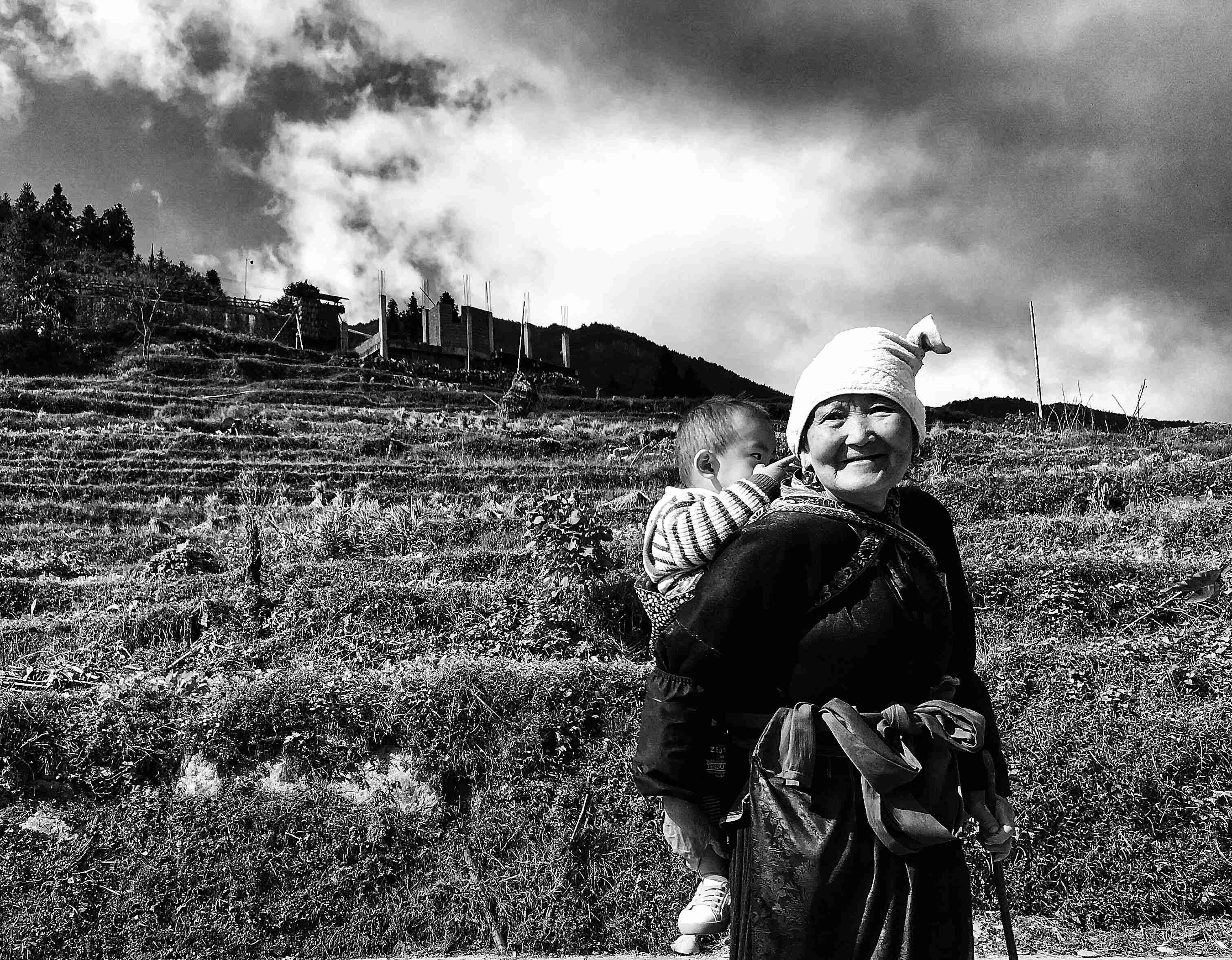 圖中這位阿婆身背父母在外地打工的孫子,看到我們?cè)谂恼沼瓮妫呱锨皝砼c我們聊天,臉上洋溢著幸福的笑容。